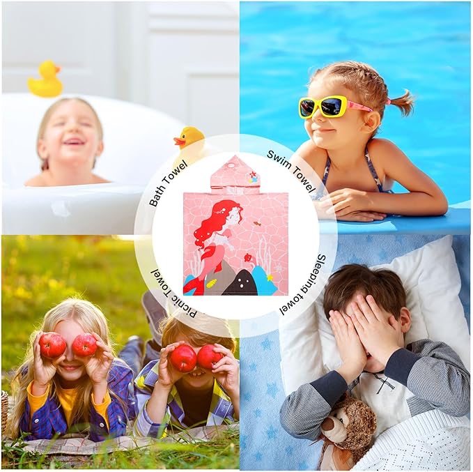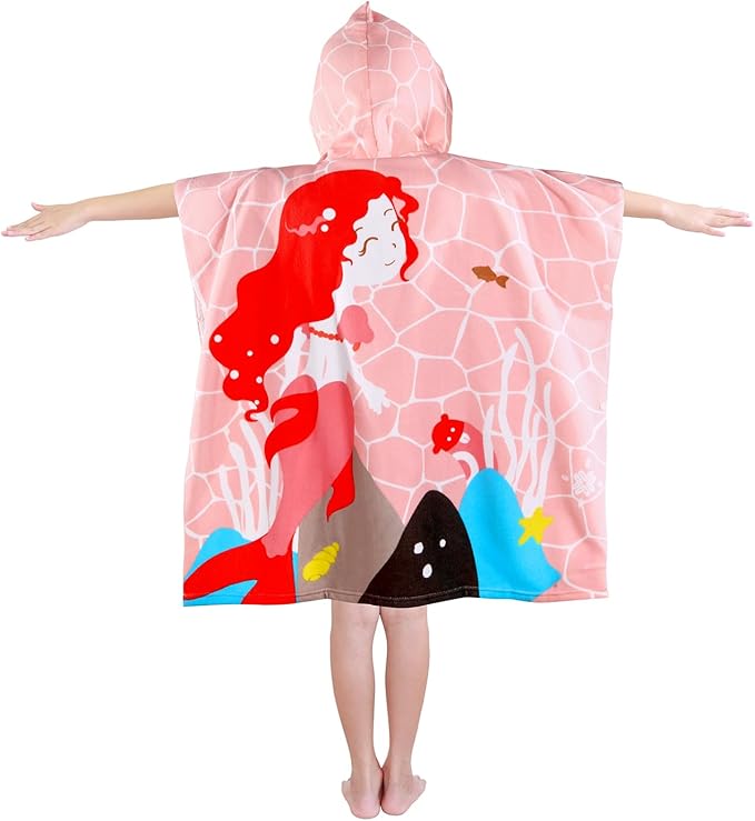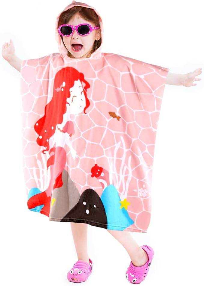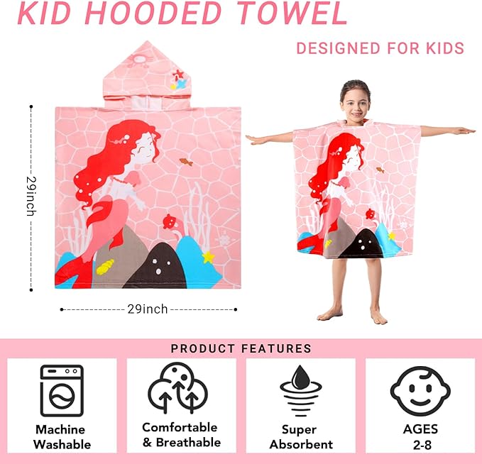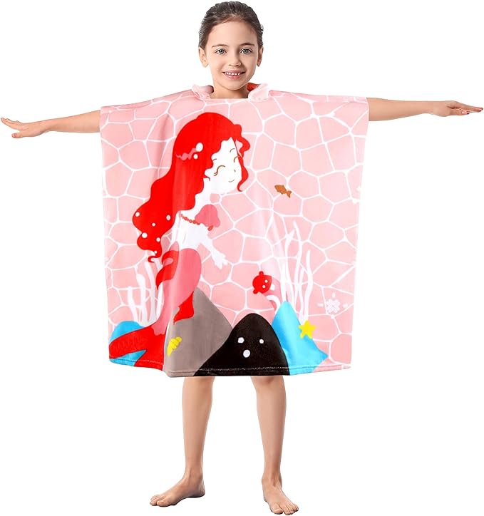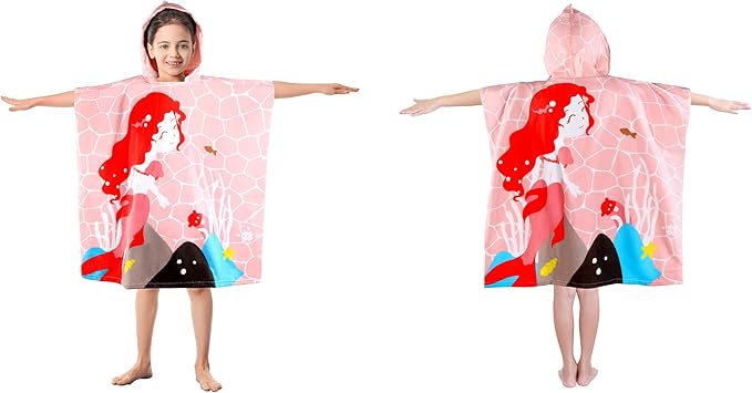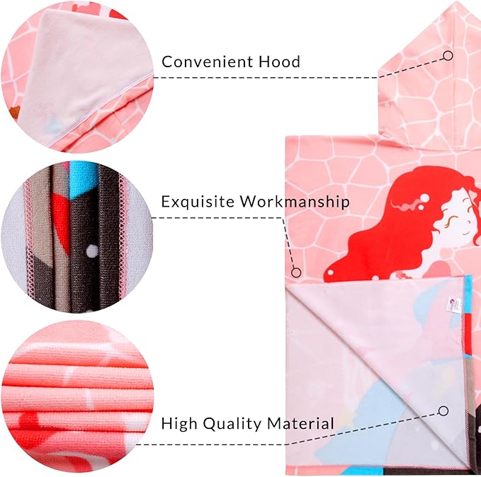 Kids Pink Mermaid Hooded Beach Towel Girls Cute Poncho Pool Towels with Hood 29*59" Soft Microfiber Swim Cover-ups for Kids Ages 3-10 Thick Absorbent Cotton Hooded Bath Towel Wrap Bathrobe