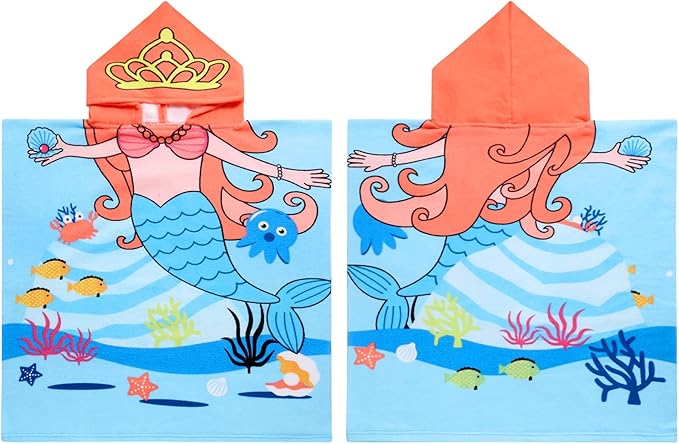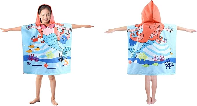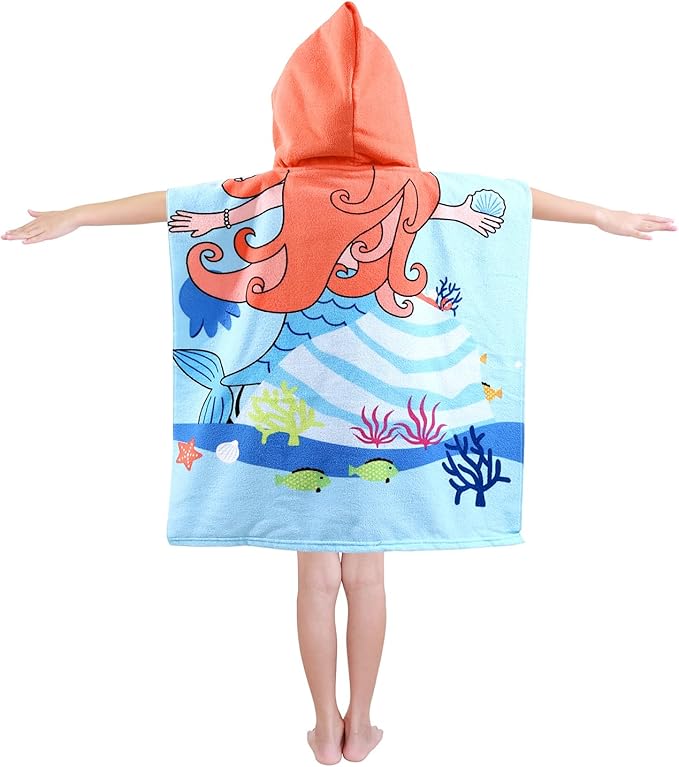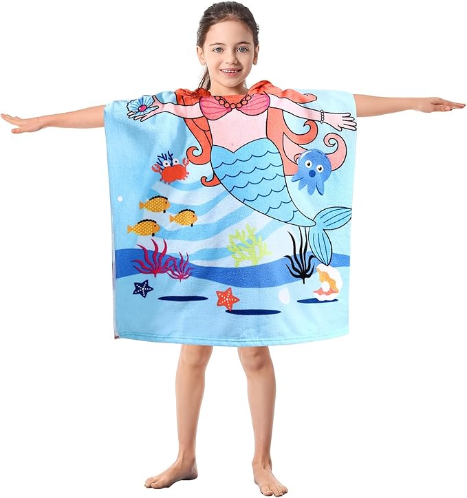 Kids Blue Mermaid Hooded Beach Towel Girls Cute Poncho Pool Towels with Hood 24*47 in Soft Microfiber Swim Cover-ups Kids Ages 3-10 Thick Absorbent Cotton Hooded Bath Towel Wrap Bathrobe