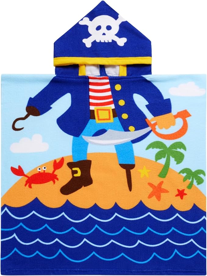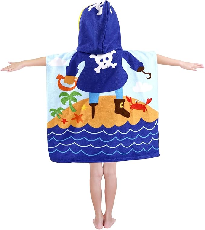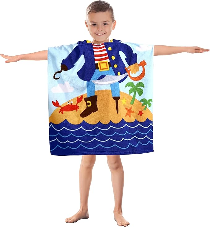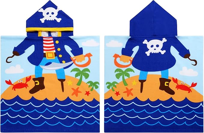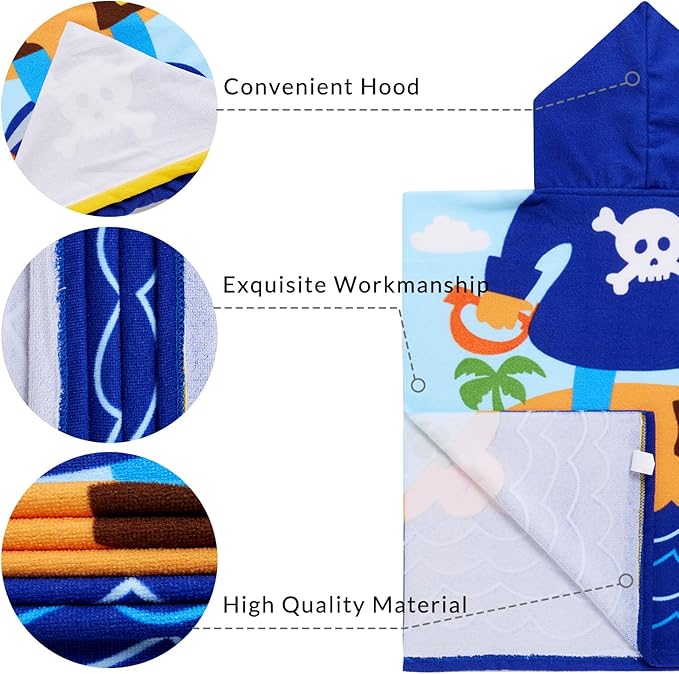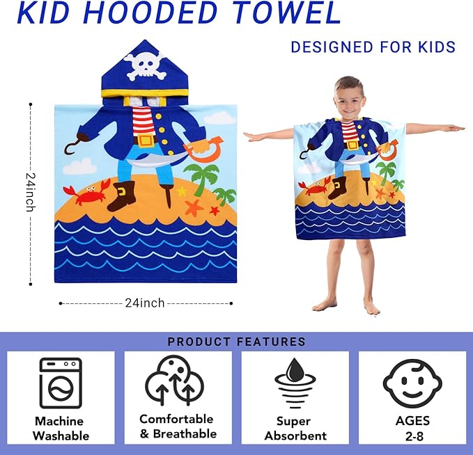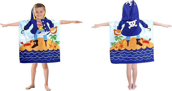 Kids Pirate Hooded Beach Towel Boys Cute Poncho Pool Towels with Hood 24*47" Cool Soft Microfiber Swim Cover-ups for Kids Ages 3-10 Thick Absorbent Cotton Hooded Bath Towels Wrap Bathrobe