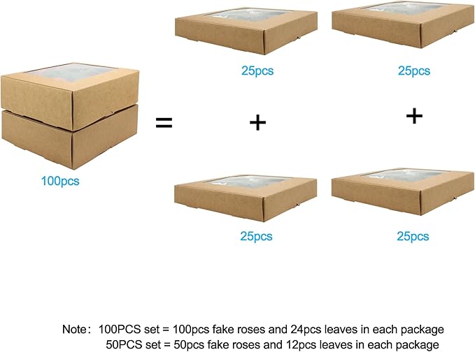 - PACKAGE : These flowers set are packaged in a nice window box that easy storage and can also be used as a nice gift. 100pcs bulk roses & & 24 leaves sets in each box.