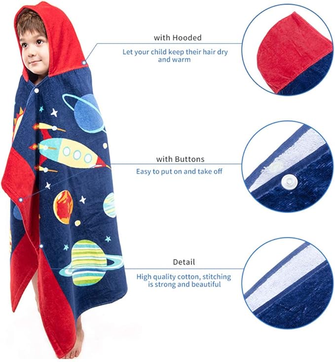 - [PRATICAL DESIGN] : Our bath & hooded towel has two snaps on the side to help you wrap your child up.This surf poncho is easy to put on and off, and will not slide down from body.The hood can helps dry your child's hair and prevent children from catching a cold.