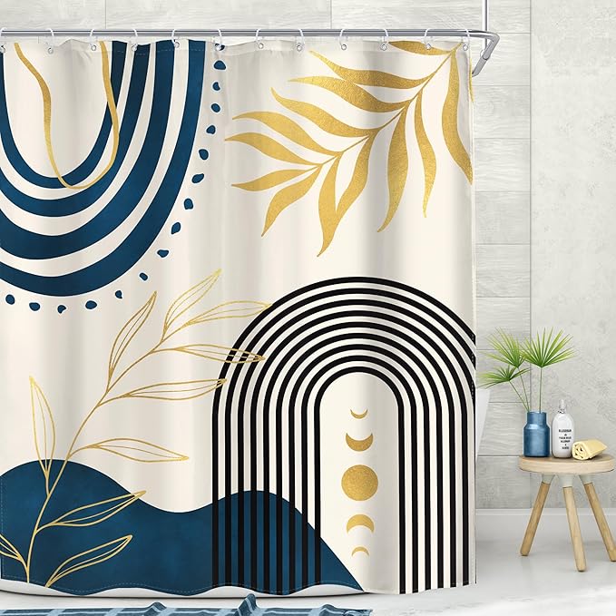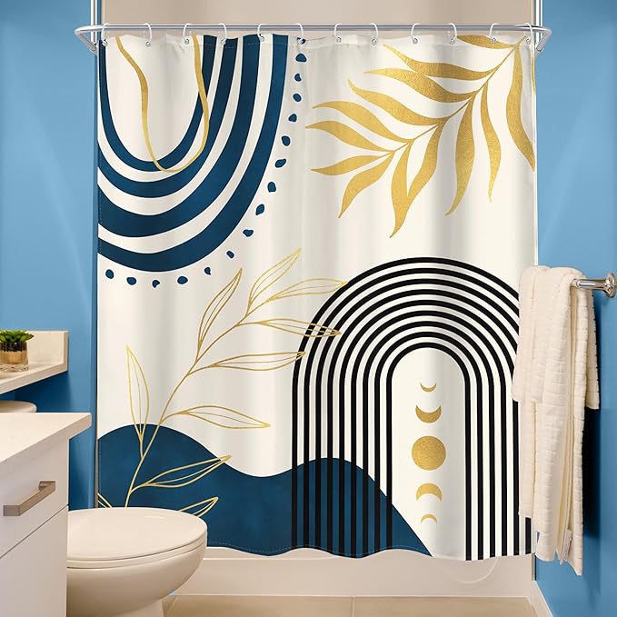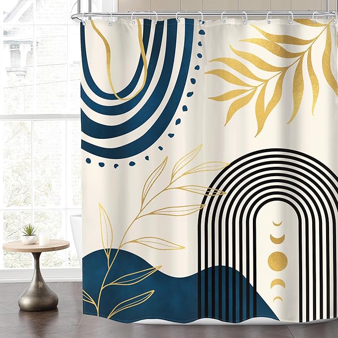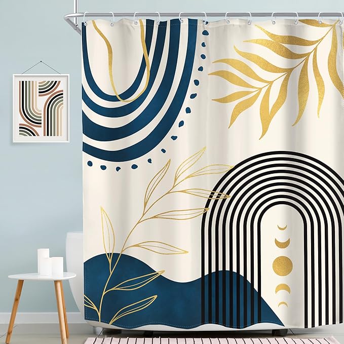 MESHELLY Navy Blue Boho Shower Curtain 60Wx72H Gold Leaves Moon Phase Minimalist Arch Bathroom Curtain Modern Bath Curtain Cloth Fabric Abstract Mid Century Bathroom Accessories Decor with 12 Hooks