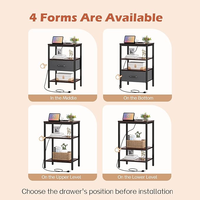 - 【Fabric Drawer, Install Up or Down】: 2 install positions of the drawer are available, you can install it for needed storage heights. 3 storage shelves and 1 fabric drawer on the bedside table are surely enough to store various items