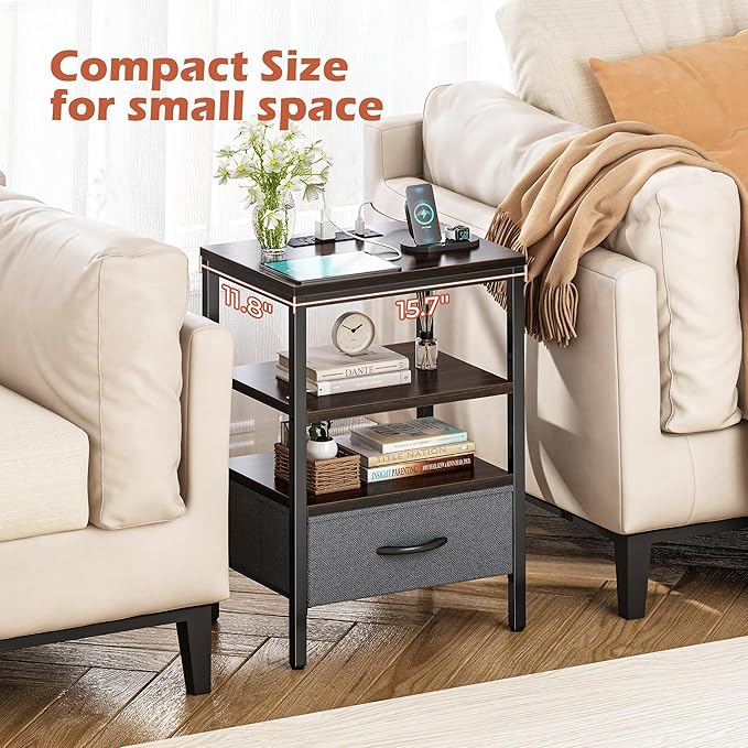 - 【Go for a Long Time】: Walnut shelves blend black metal frame and gray fabric drawer, making it a timeless classic. Sturdy P2 particle board, robust metal frame, and durable fabric drawer, all these work excellently to give this side table with charging station strong support