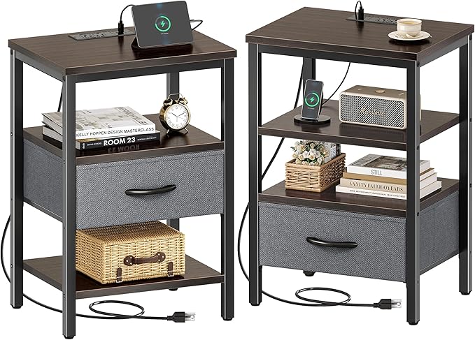 SUPERJARE Nightstand Set of 2, Bed Side Tables with Charging Station, Adjustable Fabric Drawer, Night Stand for Bedroom, 3-Tier Storage End Tables, Walnut