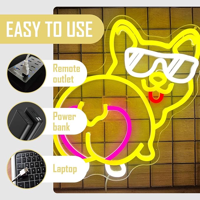 - VERY CONVENIENT:USB -driven corgi decor is energy -saving, and can be easily connected to any USB interface,which is very convenient and fast. With its adjustable function, you can regulate the brightness of neon led sign flexibly according to your preference, so as to ensure that each time can reach a perfect atmosphere