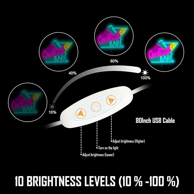 - ADJUSTABLE BRIGHTNESS:Neon cocktail lights has 3 smart buttons.The middle button controls the switch and the upper and lower button to adjust the brightness (10 %-100 %).When you turn it off and turn it on again,the smart neon light will return to its previous state without pressing any button