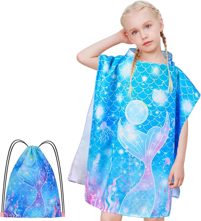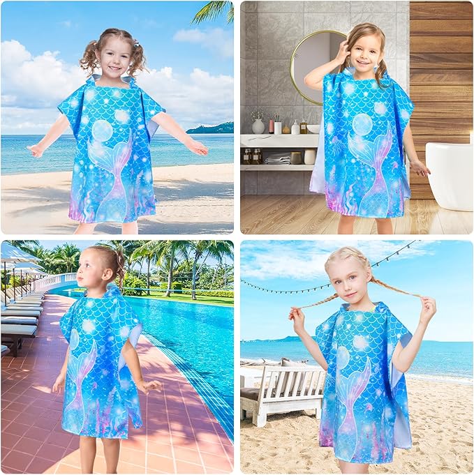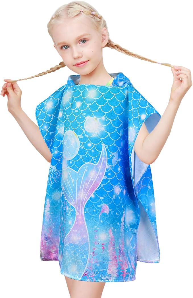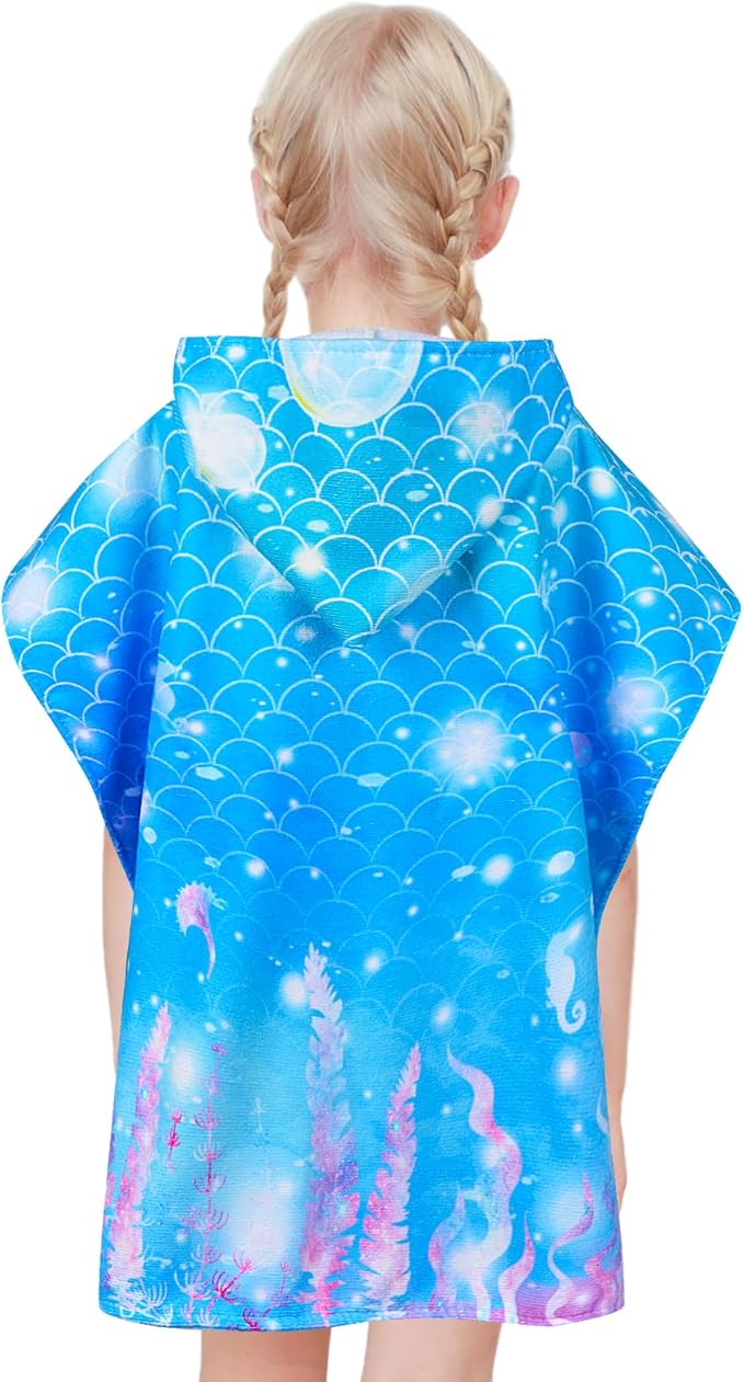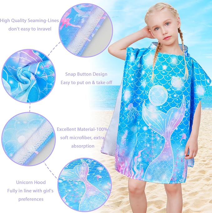 Kids Beach Towels for Girls, Unicorn Hooded Beach Pool Towels for Kids, Ultra Soft & Super Absorbent Kids Toddler Poncho Towels for 3-8 Years, 24"x24" (Blue Mermaid)