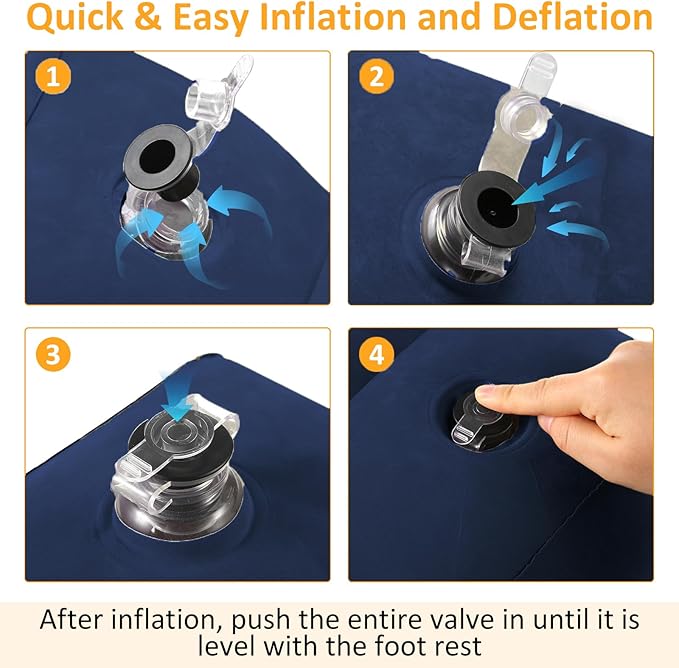 - Double Cap Valve - Our inflatable foot rest pillow with 2-in-1 double valve,the upper black air valve is a one-way air inlet for inflating or replenishing gas.bottom transparent air valve can be quickly inflated and deflated,when you are done blowing it up, push clear cover on and push whole valve in so that it is flush with the side of the travel foot pillow,the airplane footrest takes away the hassle of bringing a pump and making noise in flight.