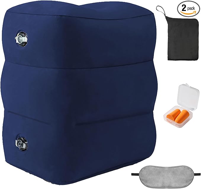 Inflatable Foot Rest Pillow for Travel - Adjustable Height Flight Foot Rest with Eye Mask and Earplugs for Kids & Adults on Airplane, Car, Train, Office, and Home (Blue, 1 PCS)