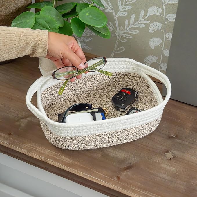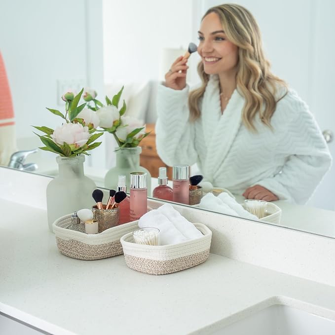 - Premium Woven Cotton Rope Baskets: These beautiful small rope baskets for bathroom provide just the right depth for displaying home decor in a kitchen, storing hand towels in the bathroom, as a baby basket organizer for nursery decor, or as a front entry catch-all.