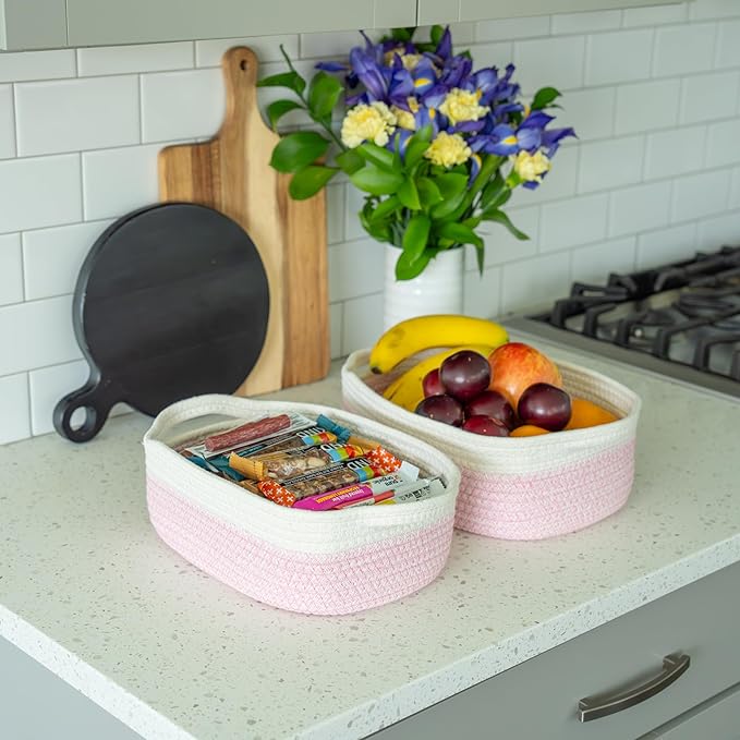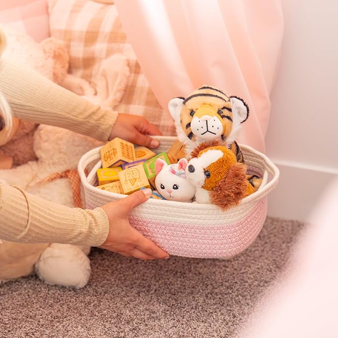 OrganiHaus Set of 5 Rectangle Bathroom Storage Baskets for Organizing, Small Woven Baskets for Storage Basket for Bathroom, Nursery Storage Basket for Baby Nursery Organization, Cute Bins, Pink/White