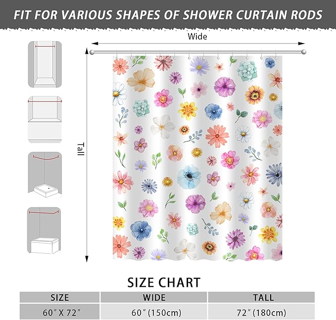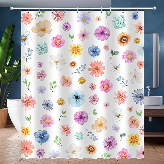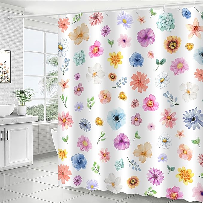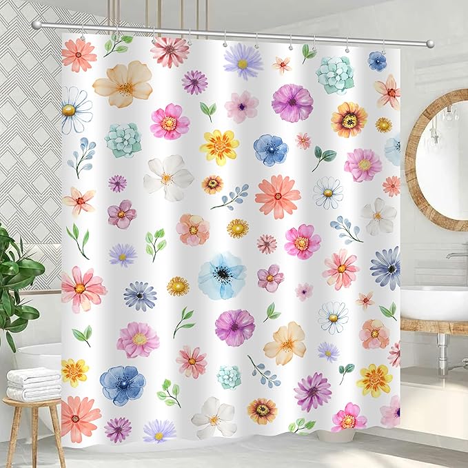 Boho Floral Shower Curtain, Spring Colorful Botanical Flower Leaves Bohemian Fabric Shower Curtain Set with 12 Hooks, Bathroom Bathtub Accessories Decor Cloth Curtain 60x72 Inches