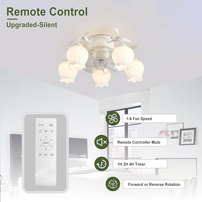 - Low Profile Fandelier with Remote Control: You can operate all the functions by the remote, like 6 wind speeds setting, 1/2/4H time setting; Reversible mode is operated through remote control, fan or lighting can be turned on separately; it's also allowed to turn the light on and off with your wall switch; low profile flush mount ceiling fans with lights save worry and energy;