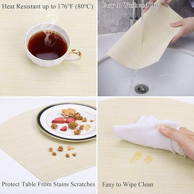 SHACOS Wedge Placemats Set of 4 Woven Vinyl Small Round Table Placemats Wipe Clean Table Mats for Round Dining Table Indoor Outdoor, Beige White