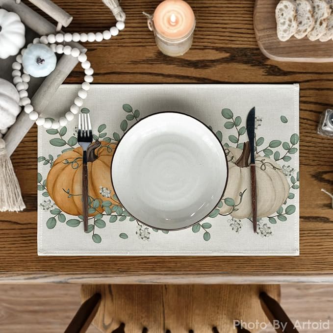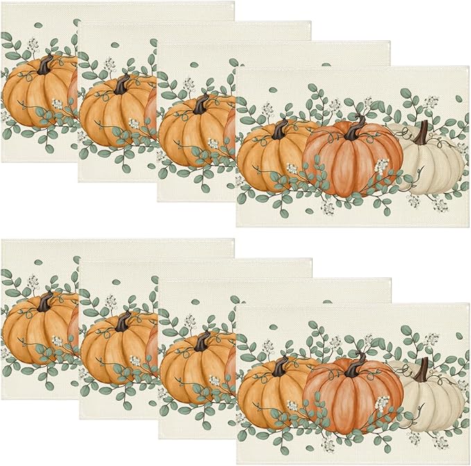 Artoid Mode Orange Pumpkin Eucalyptus Fall Placemats Set of 8, 12x18 Inch Seasonal Table Mats for Table Runner Party Kitchen Dining Decoration