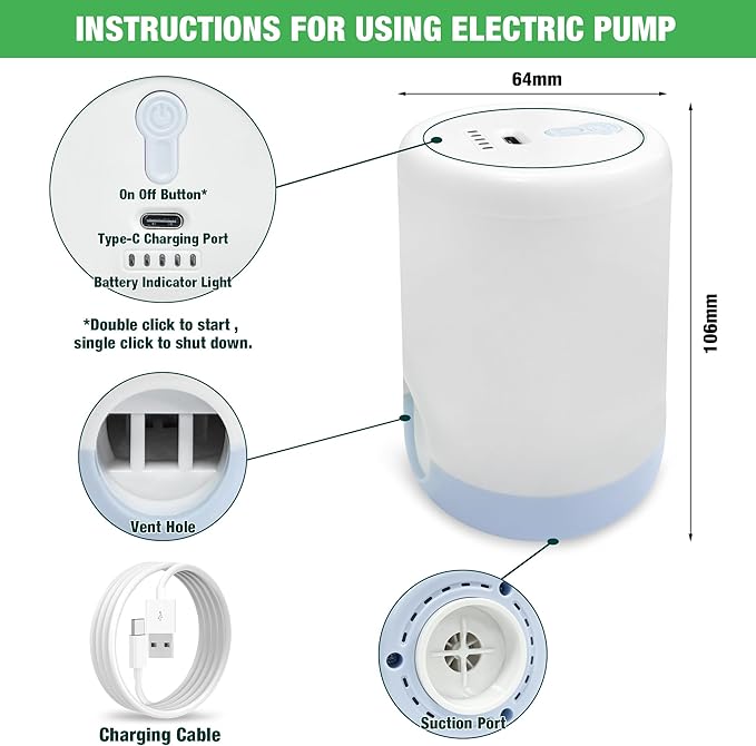 - Experience quick and easy air removal with our high-powered electric pump. Fully compress your bags in just 30-50 seconds, saving time and effort compared to traditional hand pumps. Say goodbye to manual strain and enjoy efficient storage solutions.