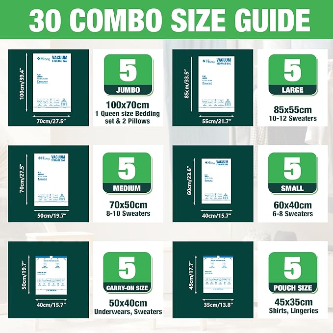 HIBAG Vacuum Storage Bags with Electric Pump, 30 Pack Vacuum Seal Space Saver Bag for Clothes, Clothing, Pillows, Blanket Bedding Comforters