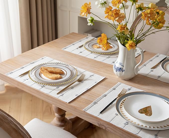 Boho Placemats Set of 4 for Dining Table Decor, Woven Cloth Place Mats for Farmhouse Rustic Kitche Home Decor, Cotton Placemats 13 x 19 Inch, Grey and Beige Table mats