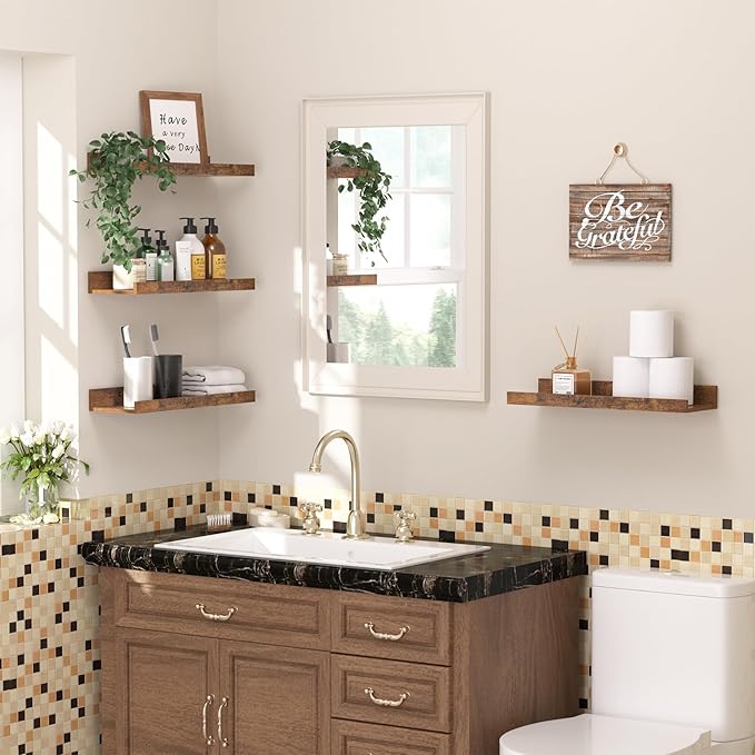 upsimples Floating Shelves for Wall, Wall Shelves for Decor Storage Set of 6, Wall Mounted Wood Shelves for Bedroom, Living Room, Bathroom, Kitchen, Picture Ledge Shelves, Brown