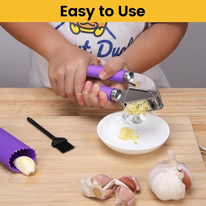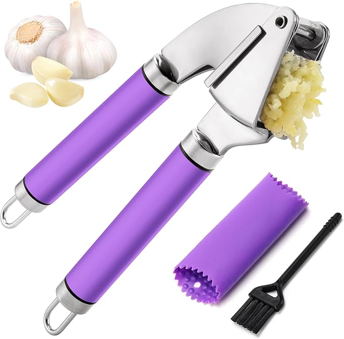 Garlic Press Mincer, 304 Stainless Steel Garlic Press with Garlic Peeler Tube, Heavy Duty Metal Ginger Press, Purple