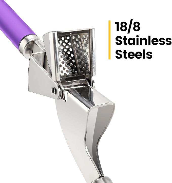 - - Ergonomic Handle: The garlic crusher tool is made of full solid 18/8 stainless steel, sturdy and durability, not easy to rust. The heavy-duty construction quickly and effortlessly minces garlic cloves or peeled ginger roots. Simply press the handle to perfectly mince and grind garlic