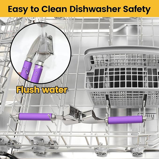 - - Easy To Clean: Dishwasher safe and can also be rinsed with water. Our stainless steel garlic press comes with a cleaning brush to avoid hard-to-remove garlic odor on your hands