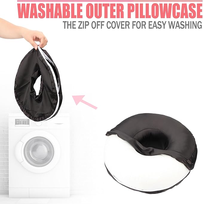Satin Ear Piercing Pillow Removable Cover Luxury Cnh Pillow with Ear Holes for Ear Pain Side Sleepers Washable Large Donut Pillows Head Neck Support Black