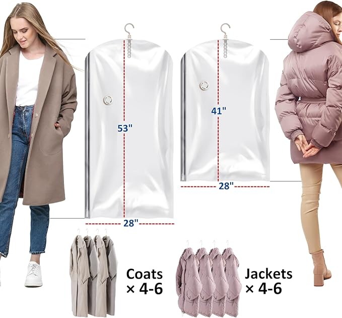 - Multi- Functions: Experience the versatility of our hanging vacuum suction bags—equivalent to a Vacuum Bag, Space-Saving Hanger, and Dustproof Hanging Garment Bag all in one