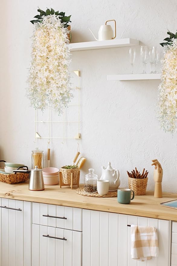 - Maintenance-free & Vivid Look Floral Rattan:These wisteria hanging flowers available in multiple colors (white/pink/purple/Champagne/Blue) that looks real-like. Dense, soft flowers and bright green leaves will create a good atmosphere. You can freely choose a hanging, garland. Hanging faux Lilac flower vines with no trimming or watering required, the dust can be washed by water and and will not wither, fade or be damaged, always keep the bright colors and fill people spirits with pleasure