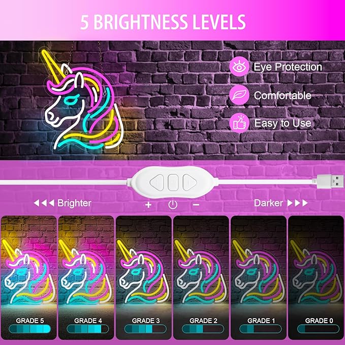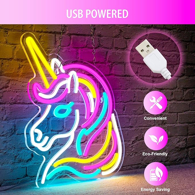 - 🔌【USB Powered Unicorn Neon Sign for Kids Room】The unicorn neon light adopts USB powered design, which is safe and energy-saving, bringing vitality to your space anytime and anywhere. led unicorn signs for girls bedroom can be easily connected to the power supply, convenient and practical. All while minimizing battery waste and environmental impact