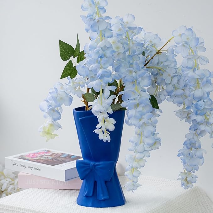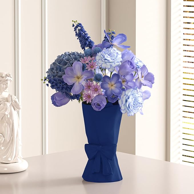 Blue Ceramic Bow Vase 9.64 in Unique Cute Modern Decorative Bouquet Flower Vases for Home Living Room Table Decor Women Girl Gifts