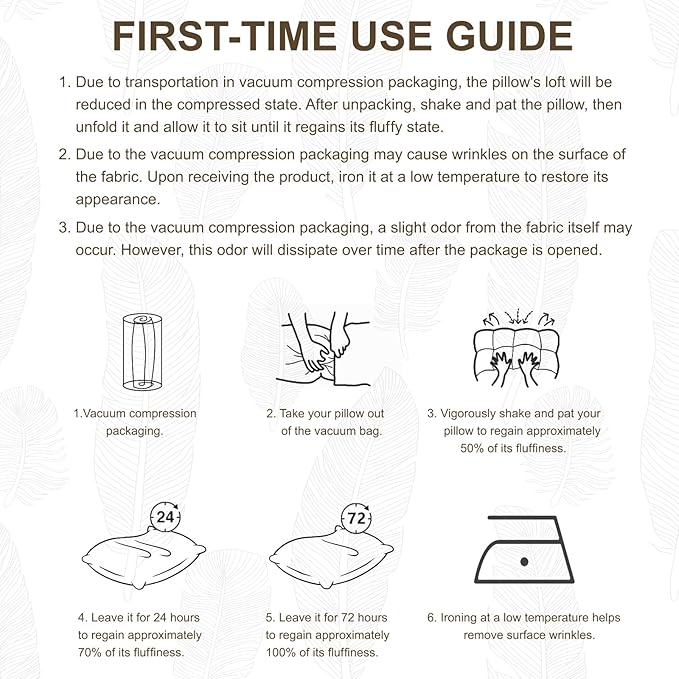 - Care Instructions: Pillow is machine washable and tumble dry low. Enjoy waking up refreshed, clean and tidy every day. Pillow packaging is supplied in roll form and there will be some wrinkling when you receive the pillow. In order for it to be fluffy and plump, the pillow needs some time to unfold, so let it fluff first and then let it sit for at least 24 hours.