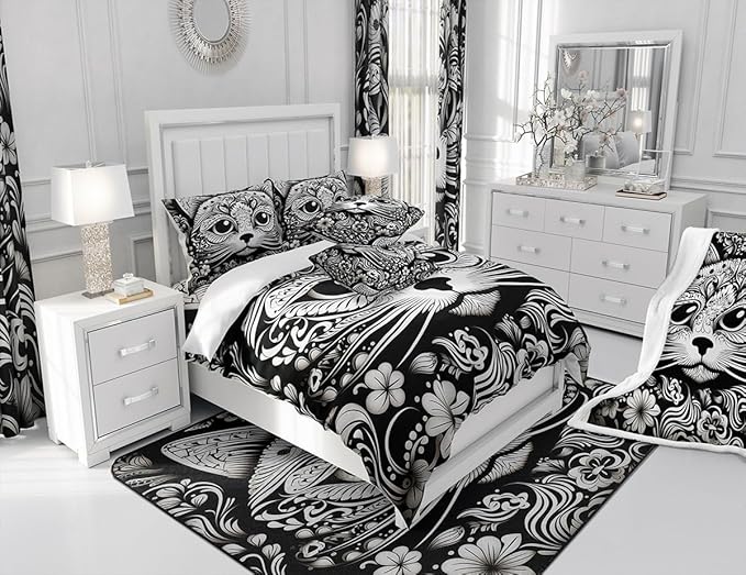 Feelyou Cute Cat Shower Curtain Damask Cat Fabric Shower Curtain for Kids Boys Girls Black White Cat Bathroom Waterproof Accessories with 12 Hooks Cartoon Cat Curtains,72x84 Inches