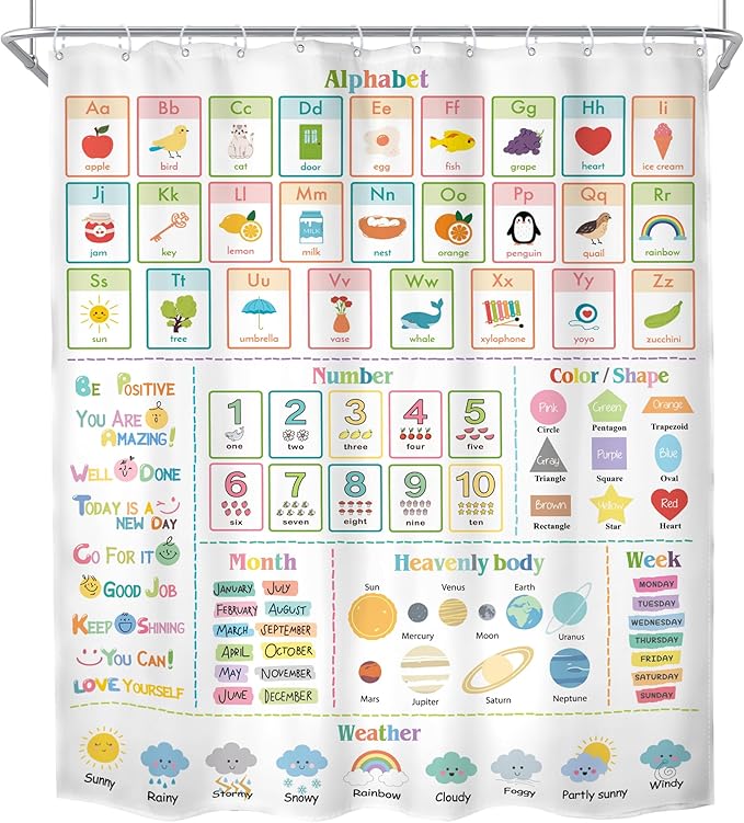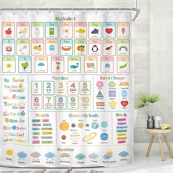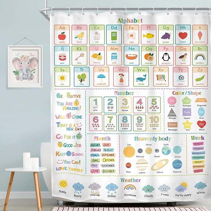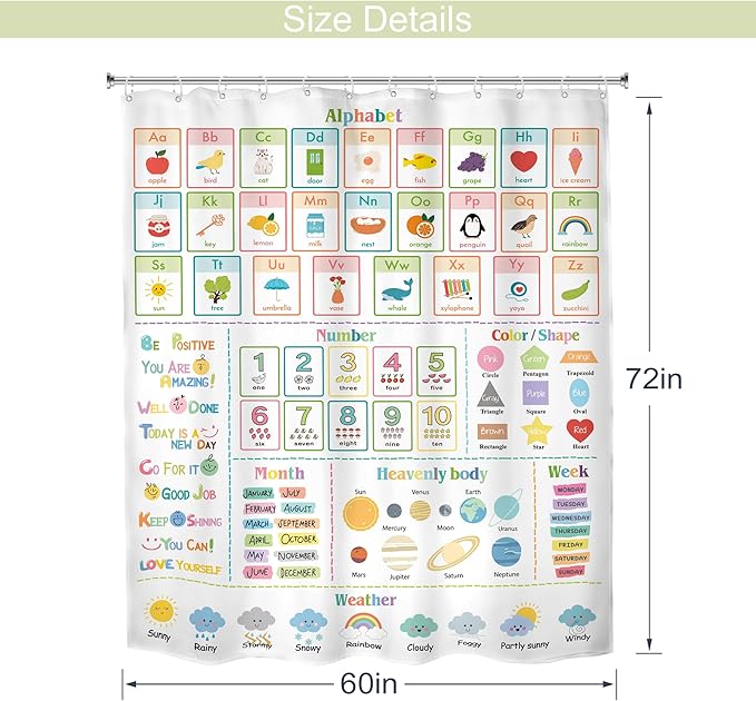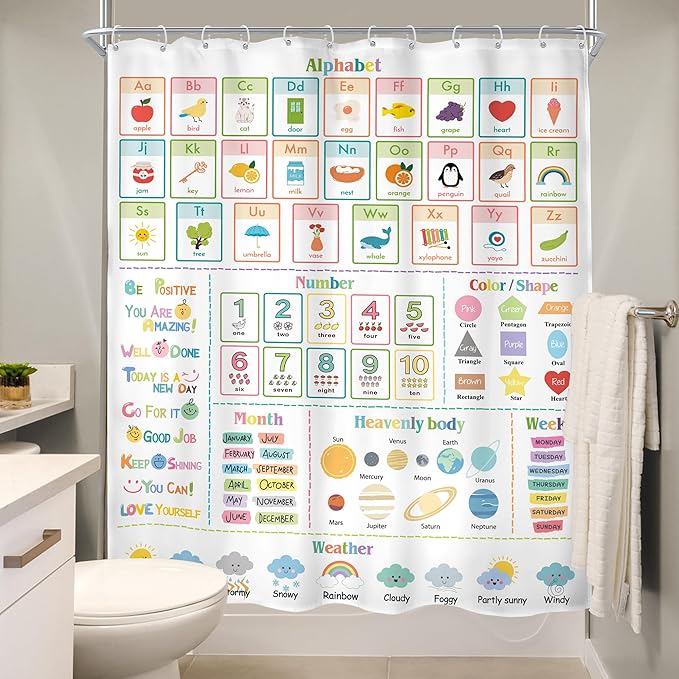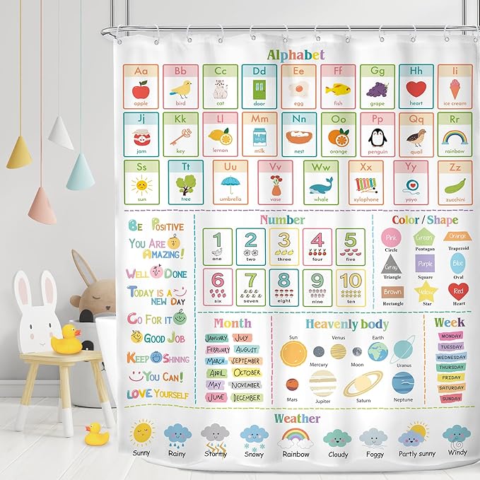 MESHELLY Kids Alphabet ABC Shower Curtain 60Wx72H Educational Funny Cartoon Cute Number Shape Baby Nursery Bathroom Curtain Colorful Bath Curtain Cloth Fabric Bathroom Accessories Decor with 12 Hooks