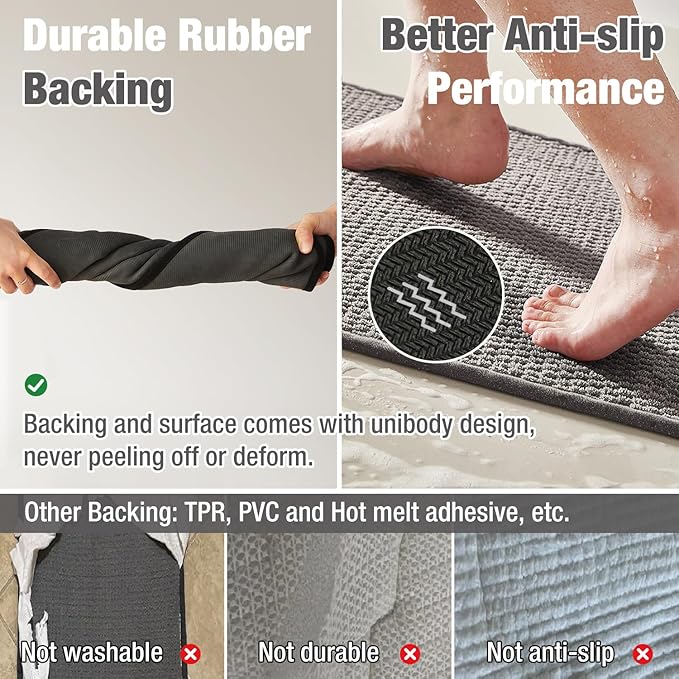 - Upgraded Non-Slip Backing: Our bathroom mats feature natural rubber backing, increasing slip resistance of a floor surface. They tightly grip smooth surfaces without skidding, and hence prevent and reduce the risk of falls for kids and the elderly. Say goodbye to slippery PVC/TPR bathroom mat—step out safely with our secure, stable design