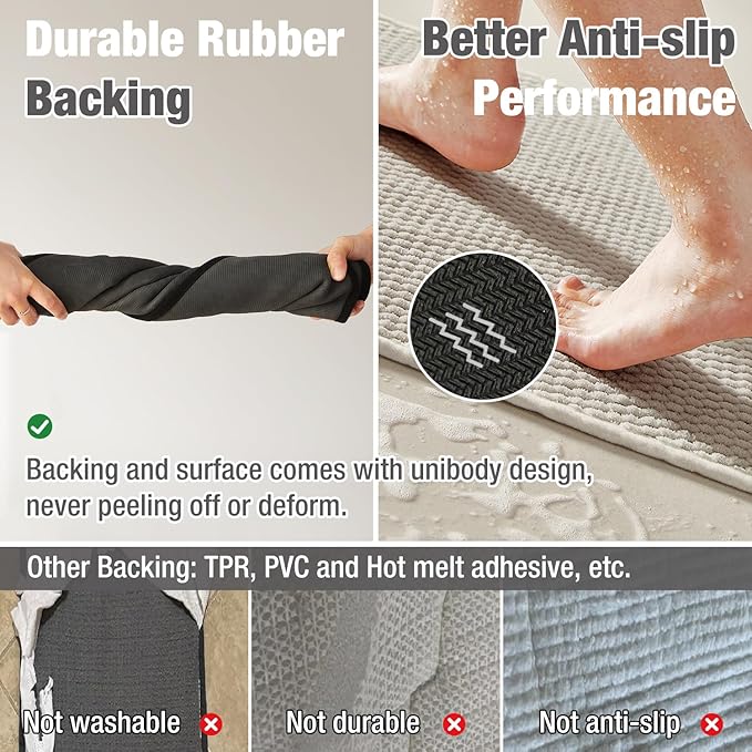 - Upgraded Non-Slip Backing: Our bathroom mats feature natural rubber backing, increasing slip resistance of a floor surface. They tightly grip smooth surfaces without skidding, and hence prevent and reduce the risk of falls for kids and the elderly. Say goodbye to slippery PVC/TPR bathroom mat—step out safely with our secure, stable design