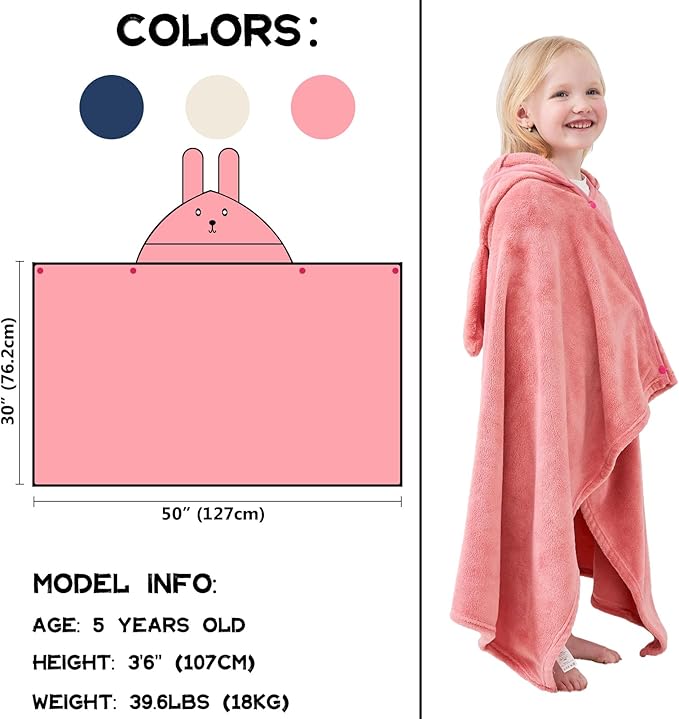 - Suitable Size: This hooded towel is suitable for children aged 3-12, both boys and girls. Featuring a cute rabbit hood design. WidithÃLength: 50Ã30 inches. Weighs: 0.77 pounds.