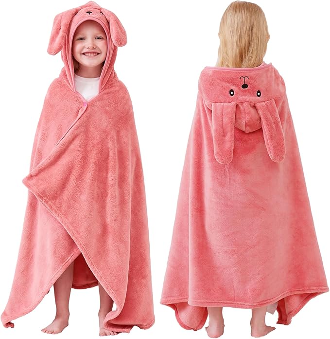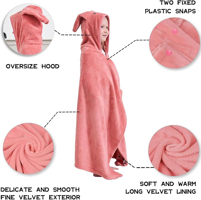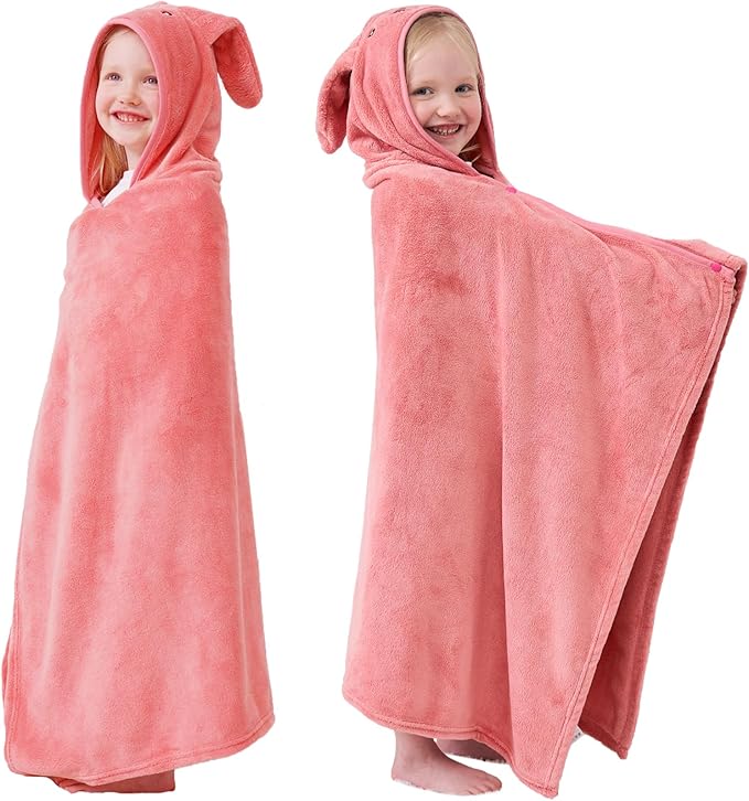 Hiturbo Kids Animal Hooded Towel: Soft Plush Fleece Blanket - 50"x30" Swim Cover Up - Pool Beach Bath Towel Wrap for 3-12 Yrs (Pink Rabbit)