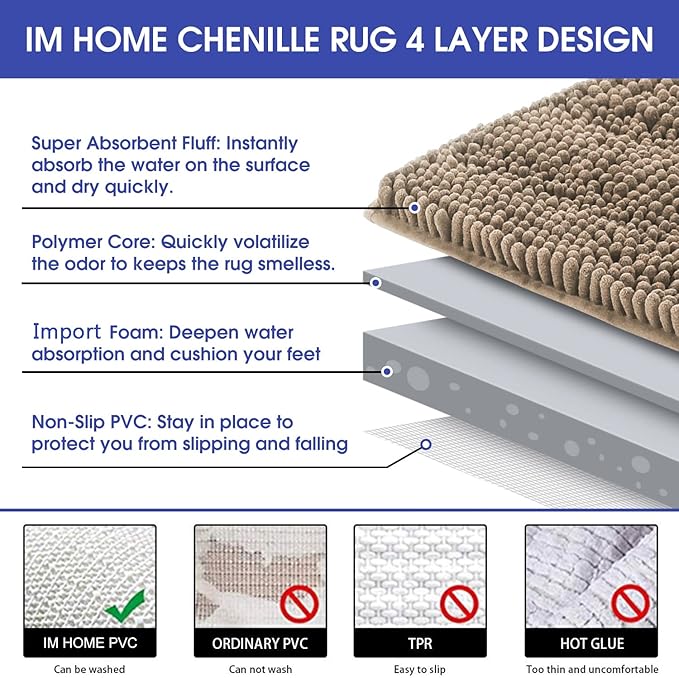 - SUPERIOR ABSORBENCY: The bold pile chenille on the top surface of the luxurious toilet mat soak up a lot of water and keep your floor dry when you're stepping out of the bath, Bathtub, shower, or getting ready by the sink, moisture is trapped in the bathroom rug’s deep pile, to avoid the dripping water disturbing your bathroom's serenity and tidy.