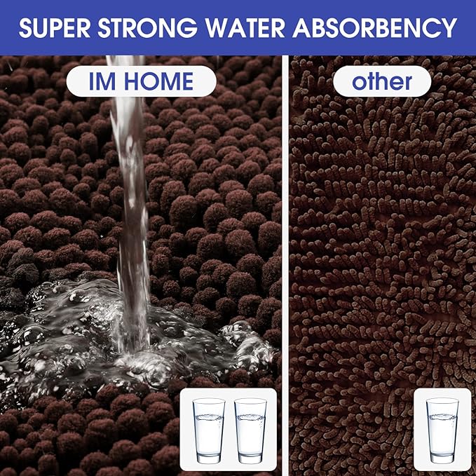 - SUPERIOR ABSORBENCY: The bold pile chenille on the top surface of the luxurious toilet mat soak up a lot of water and keep your floor dry when you're stepping out of the bath, Bathtub, shower, or getting ready by the sink, moisture is trapped in the bathroom rug’s deep pile, to avoid the dripping water disturbing your bathroom's serenity and tidy.