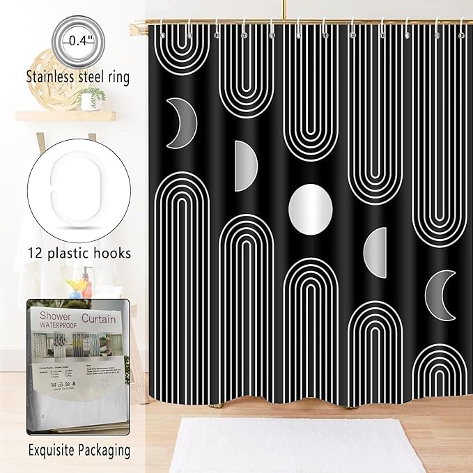 Boho Shower Curtains for Bathroom Mid Century Minimalist Abstract Aesthetic Modern Bathroom Decor Curtain Machine Washable Waterproof Fabric with 12 Hooks (Black Minimalist, 72" x 72")