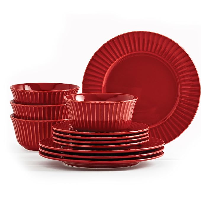 Tabletops Gallery Richmond 12-Piece Reactive Glaze Stoneware Dinnerware Set of Kitchen Dishes, Dinner Plates, Cereal Bowls, Service for 4, Red