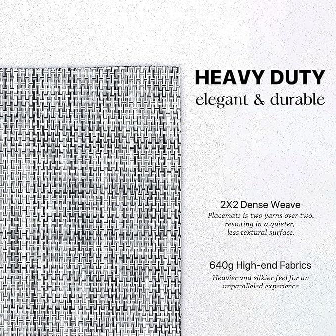 - HEAVY-DUTY: We uses the German-imported higher grammage vinyl material (Specialty PVC) than other placemats on the market, plus the precise, dense weave craftsmanship to give the woven placemats a thicker feel and make the place mats long-lasting.