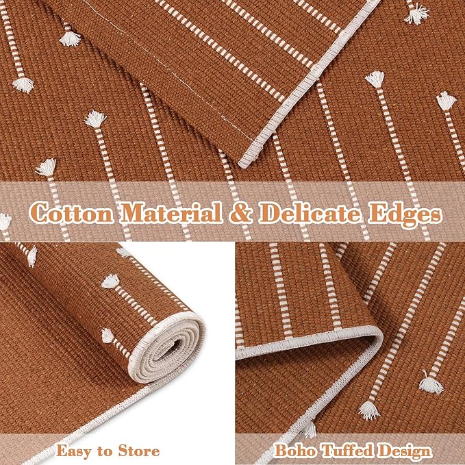 - [Larger Size Rug]:Our burnt orange boho rug measures 27.5" x 43", which is larger than most outdoor rug.The 0.2" thick orange and white cotton rug is sturdy and comfortable, but WITHOUT RUBBER BACKING. Use a rug pad underneath to prevent it from moving when used in high traffic indoor areas