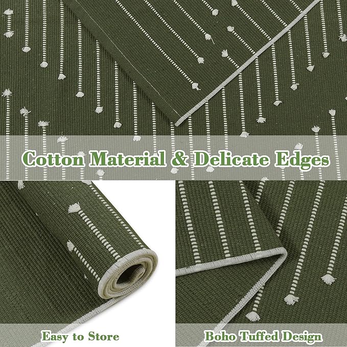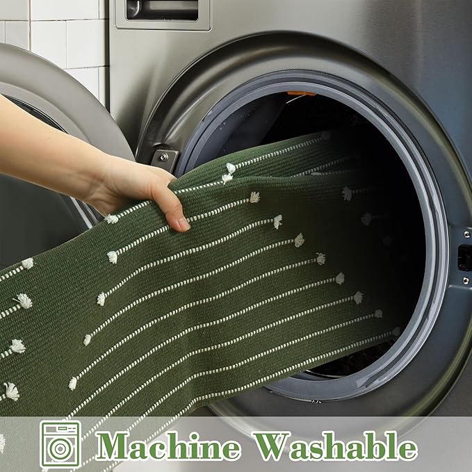 - [Hand-Woven without Tassels]:The green and white kitchen rug runner is using non-printed technology, which makes it last longer and prevents shedding and fading. The extra knot stripes add a lovely and trendy touch