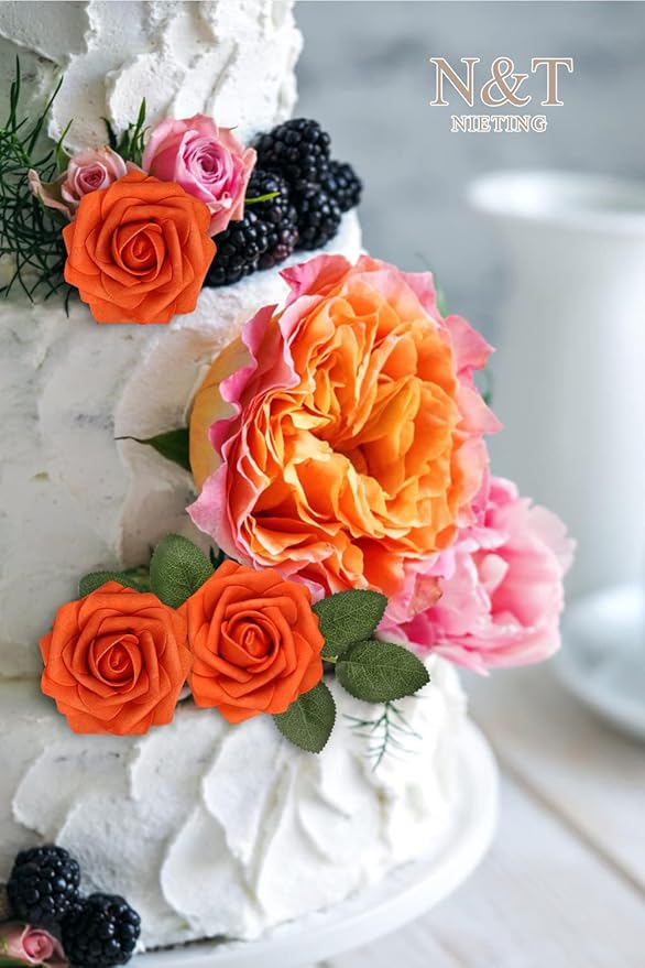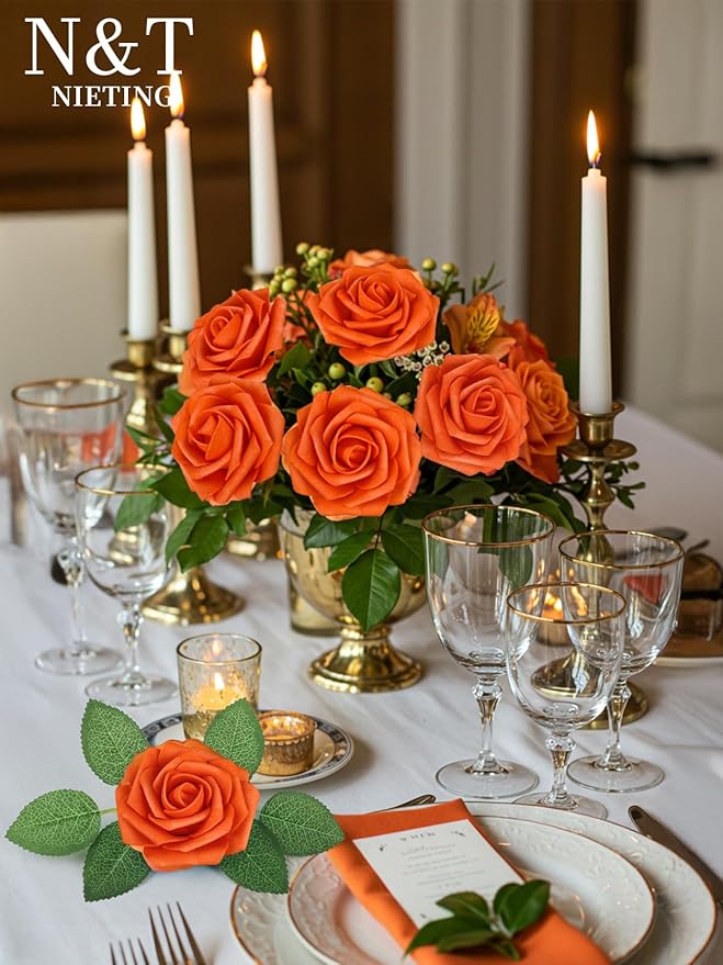 N&T NIETING Artificial Flowers, Fake Flowers Burnt Orange Roses Perfect for DIY Wedding Bridal Bouquets Centerpieces Bridal Shower Party Home Flower Arrangement Decorations, 50Pcs