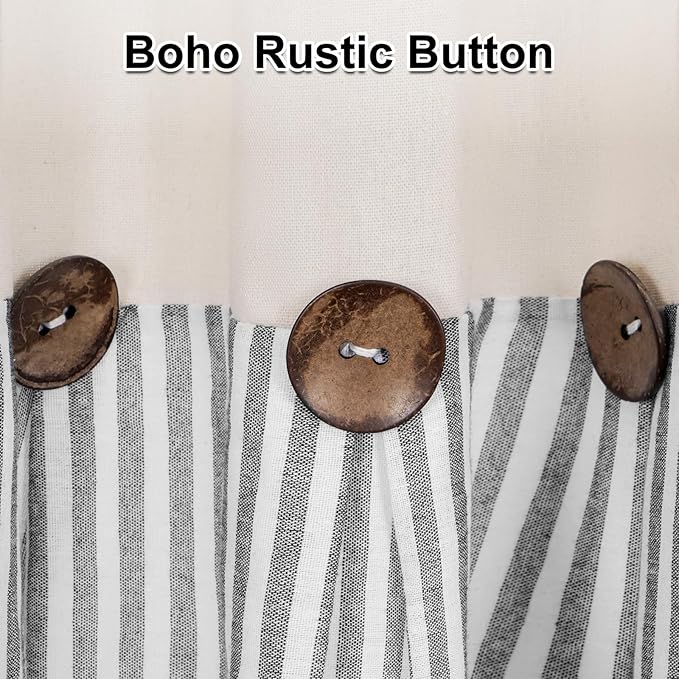 - BOHO COTTON LINE CURTAINS: These premium farmhouse curtains are crafted from natural cotton linen fabric. Each boho curtain pannel has 8 exquisite brown decorative buttons. These grey stripe line curtains create a neutral style and add a classic look to your home
