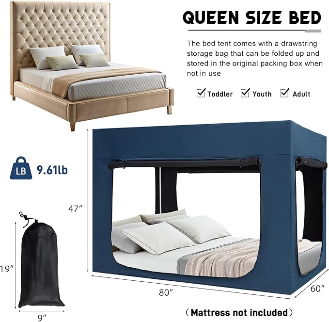 - ☑Easy to Intall and Store: A detailed installation manual is included in the package, it only takes a few minutes to install. In addition, the bed tent comes with a drawstring storage bag that can be folded up and stored in the original packing box when not in use.