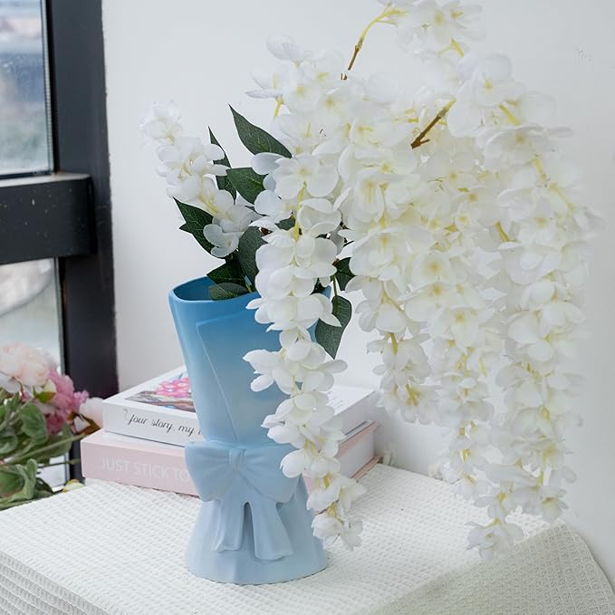 Gradient Blue White Ceramic Bow Vase 9.64 in Unique Cute Modern Decorative Bouquet Flower Vases for Home Living Room Table Decor Women Girl Gifts